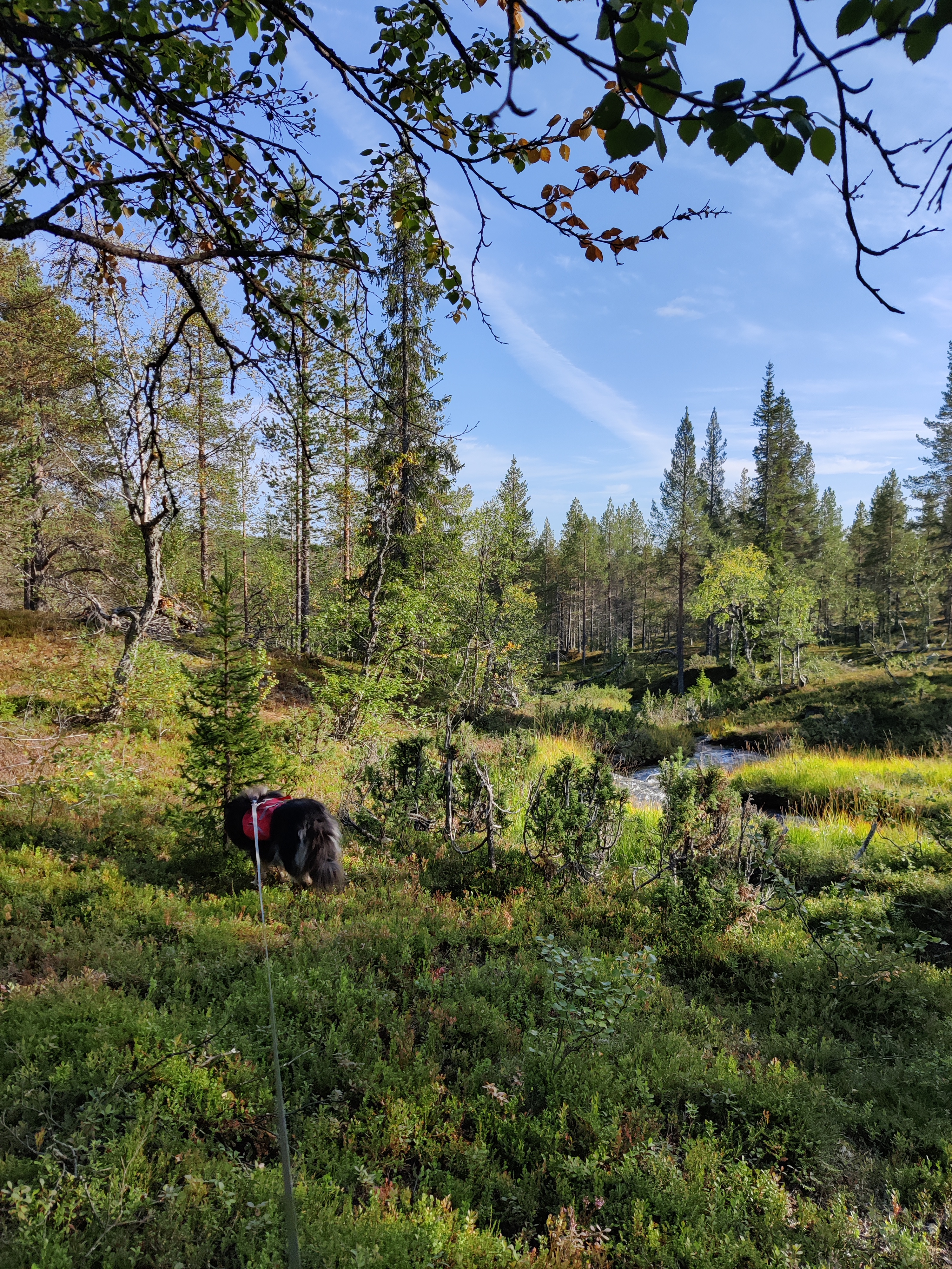 Harrijoen virtaus oli hurja. Ylityspaikalla oli suuri mänty kaadettuna joen yli, aprikoin uskaltaisinko ylittää joen sitä pitkin. Valmistuin kantamaan koiran, virtaus oli sille liian hurja uitavaksi. Yllätyksekseni Kiiski hiippaili joen yli mäntyä pitkin. Jännittyneenä tulin perässä, puu oli yllättävän hyvä kulkea. Paijasin koiraa palkkioksi hyvin suoritetusta ylityksestä!